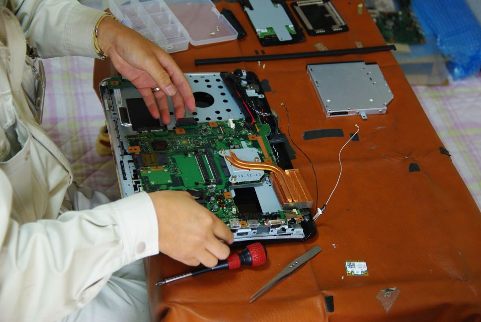修理担当の技術者の方は、テーブルにシートを敷いて、その上でノートパソコンを分解し、メインボードを取り替えて、メモリを載せ換えて、組み立て直した。