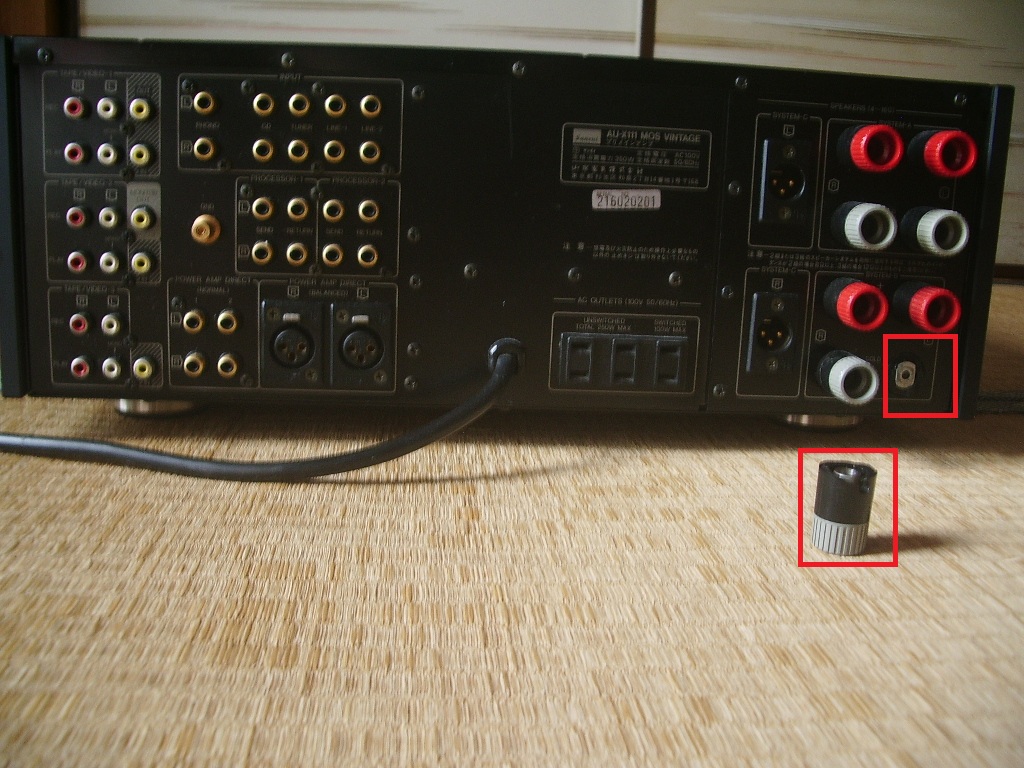AU-X111 MOSに接続したスピーカーケーブルを外して、ねじを軽く締めたら、修理したスピーカー端子の隣の端子が根元からポロッと折れてしまった。 樹脂部品の劣化と思われる。