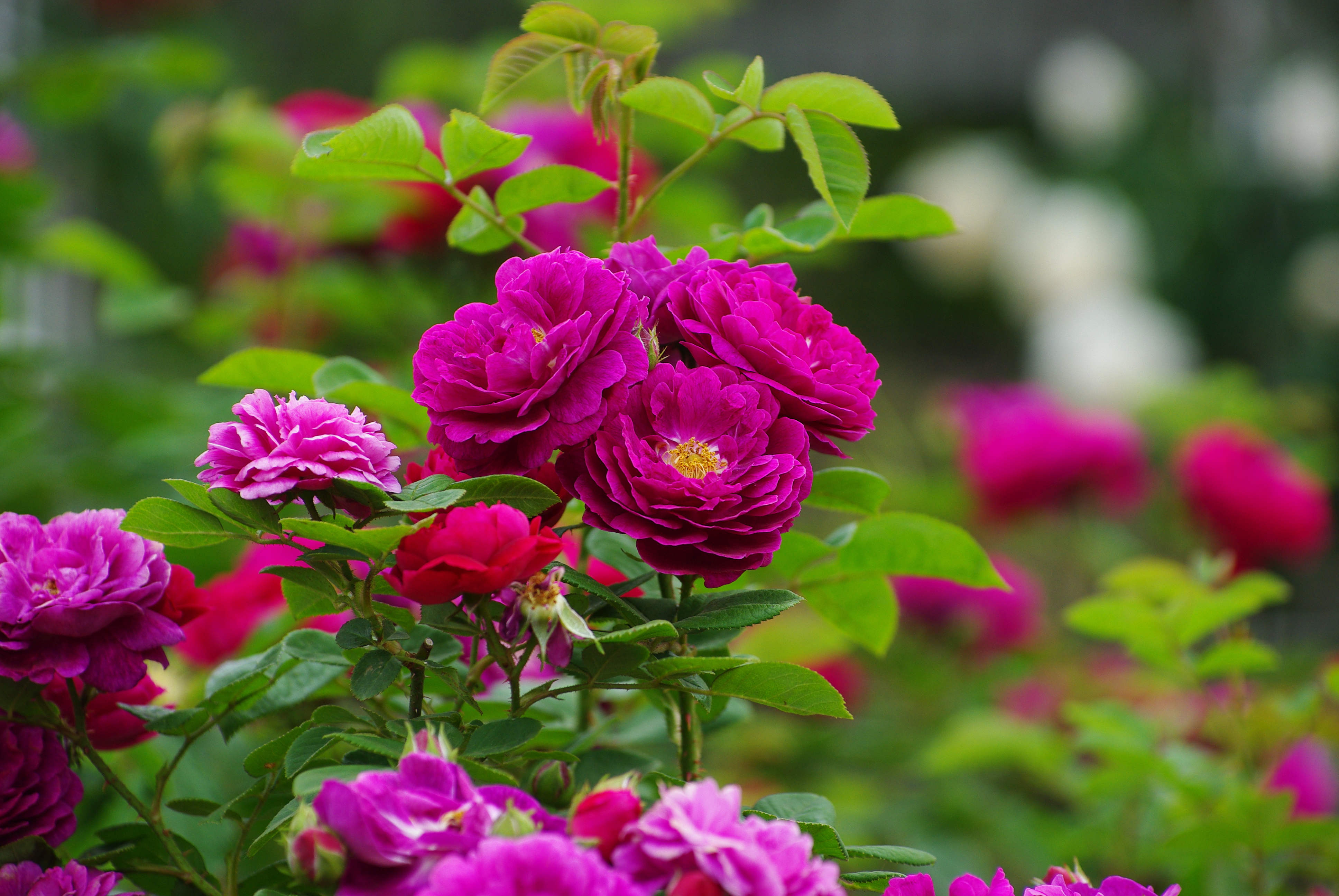 バラの香りは控え目であったが、多くの花が咲いていて、まだ蕾もかなりあったので、公開期間一杯はまだ咲き続けるだろう。公開直後の土曜日ということもあり、入園者も多かった。最初はMacro 100mmで撮影し、途中から望遠ズーム50-135mmにレンズ交換して撮影した。また途中で電池がなくなったので、予備電池に交換した。
