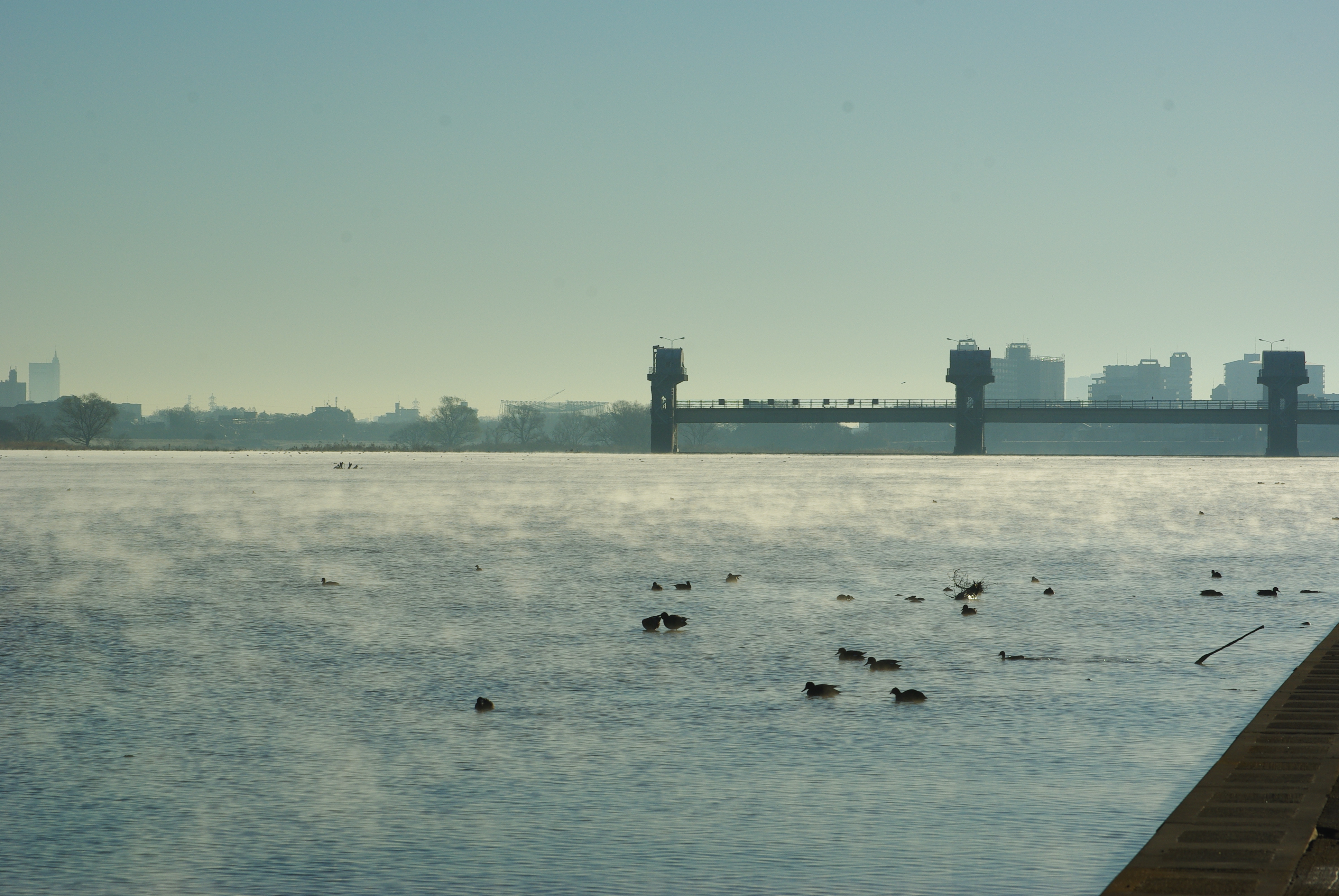 1月13日(水)の朝は気温が低かったので、多摩川の水面から湯気のようなものが立ち上っているのを見ることができた。