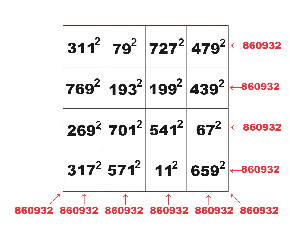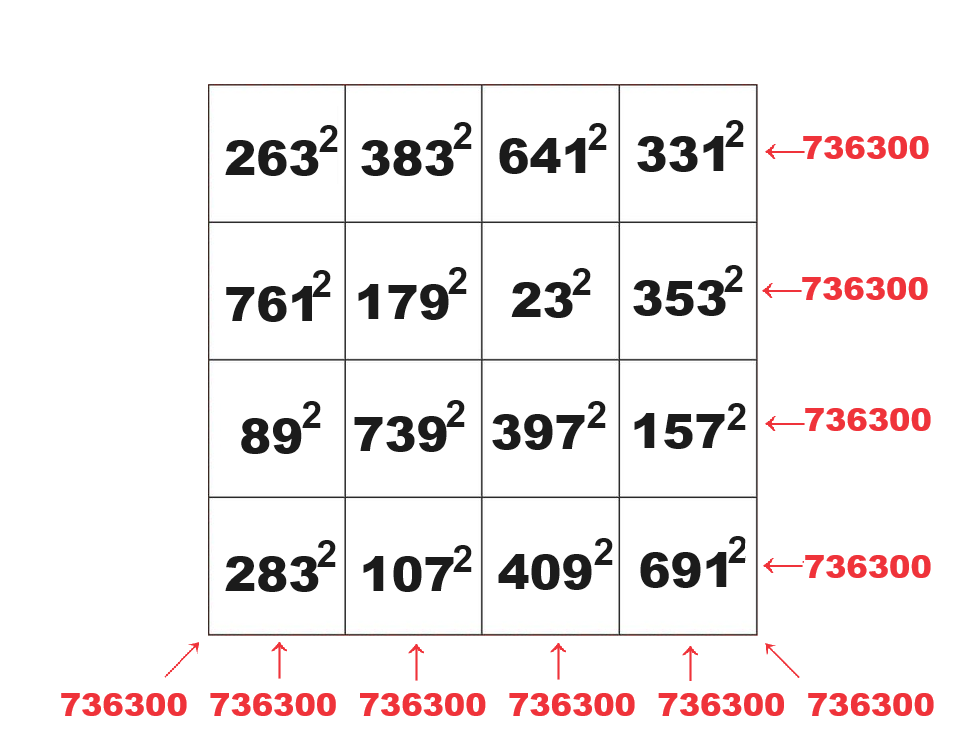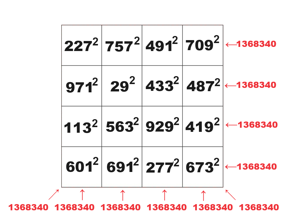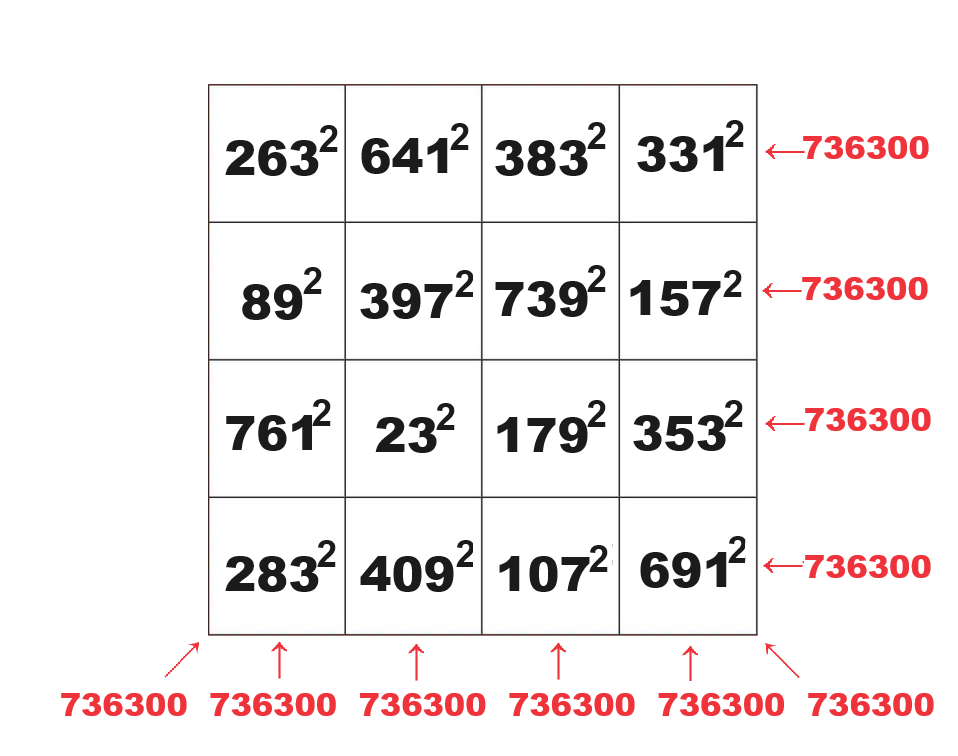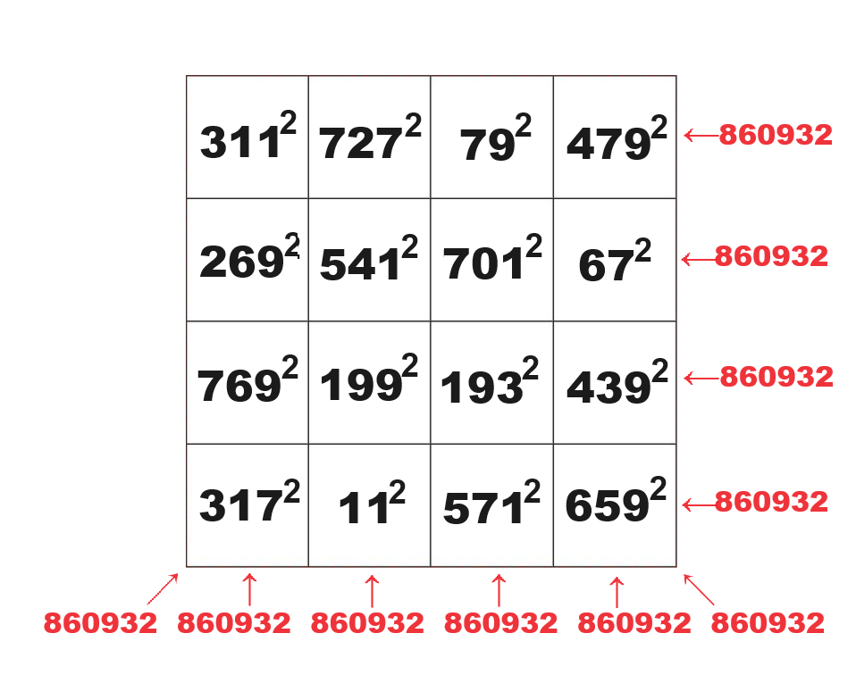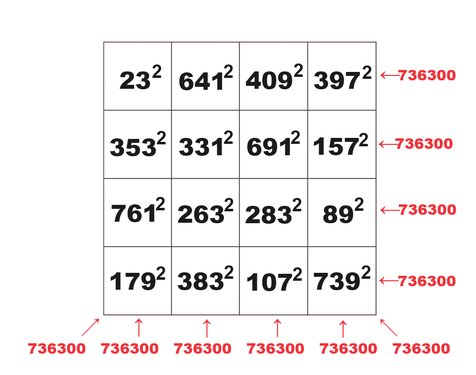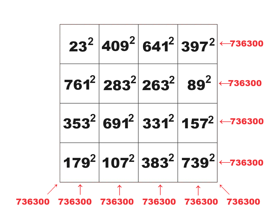 相異なる正整数の平方数から成る4x4魔法陣A(ここでは、Aを4x4平方数魔法陣と呼ぶ)を求めよ。
