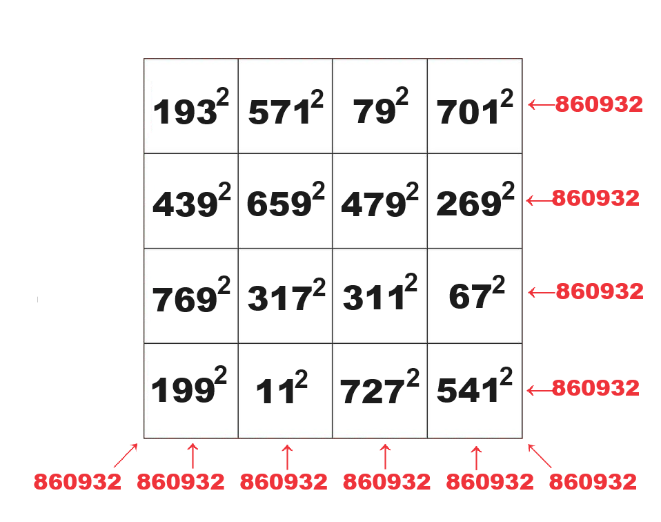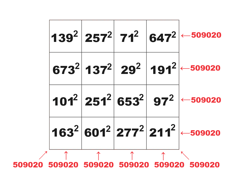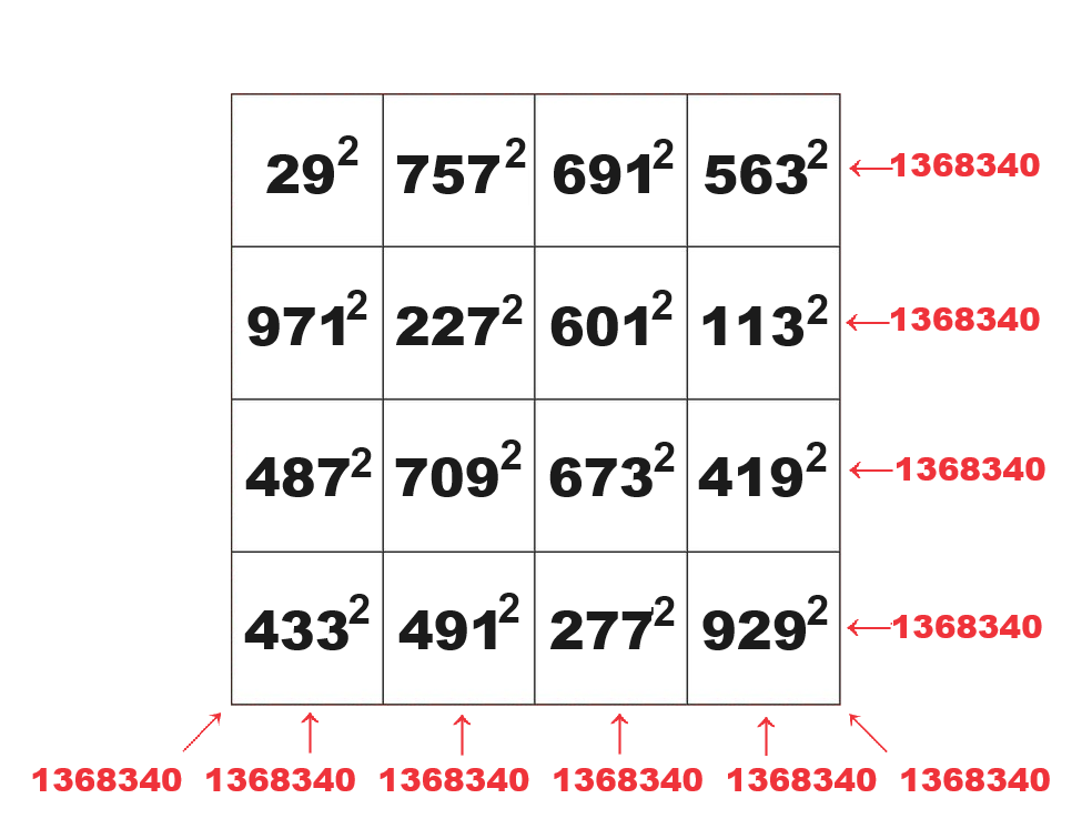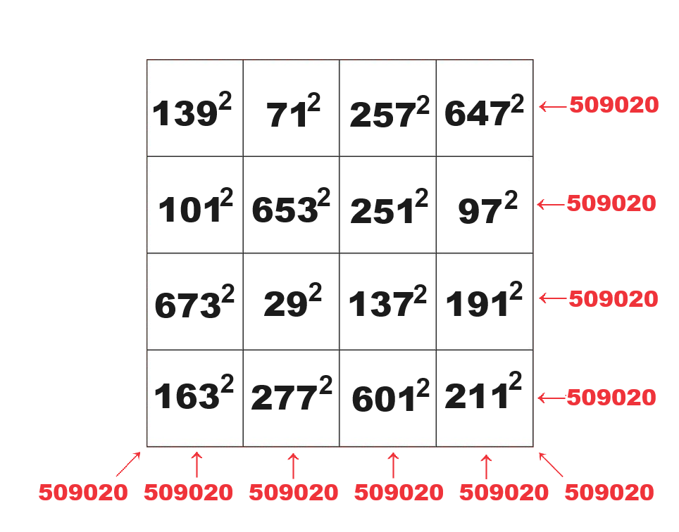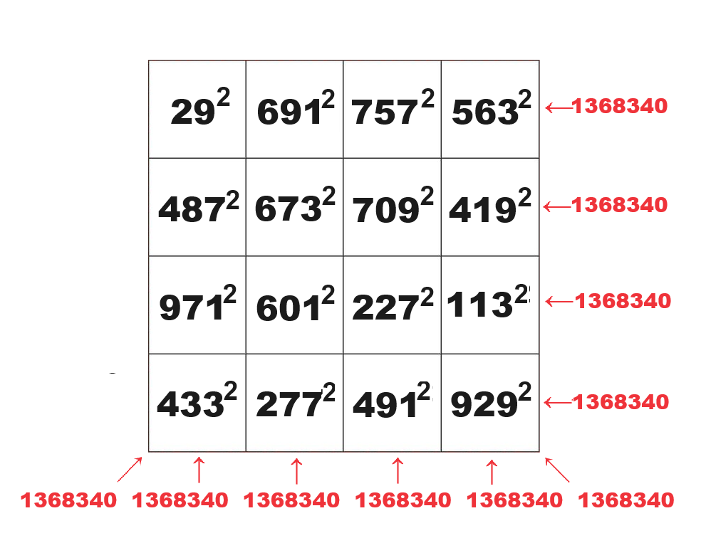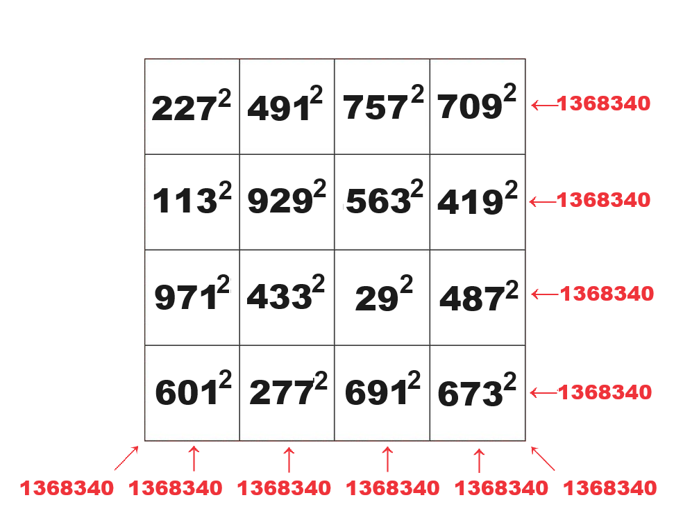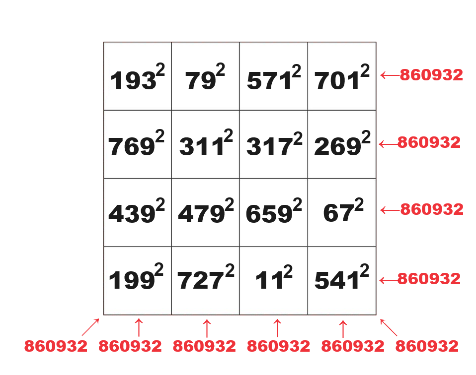 相異なる正整数の平方数から成る4x4魔法陣A(ここでは、Aを4x4平方数魔法陣と呼ぶ)を求めよ。