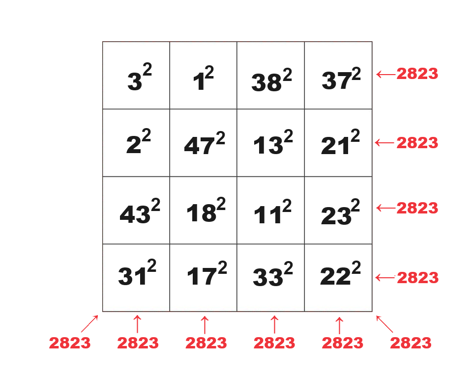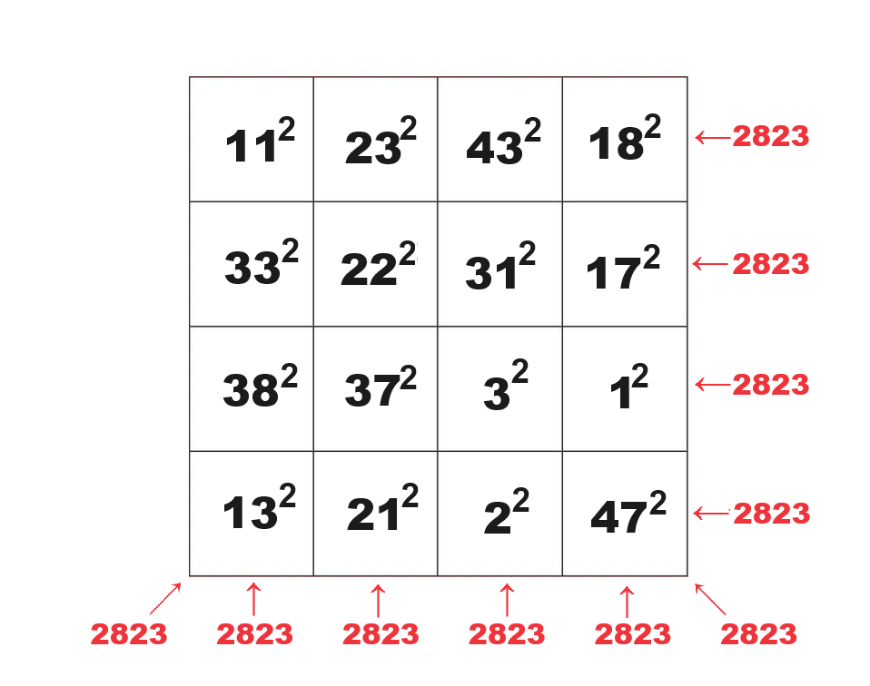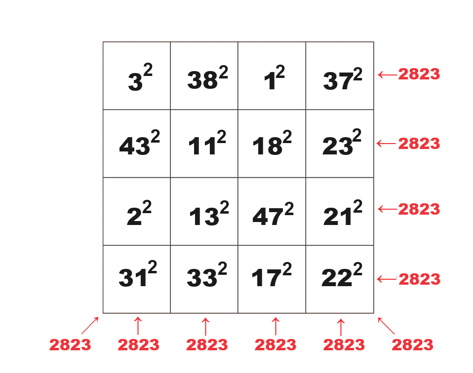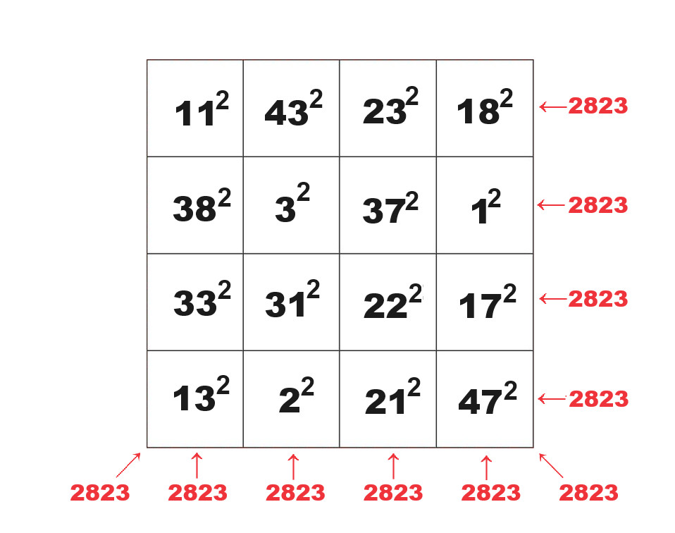 このような4x4平方数魔法陣は存在する。|A|=max{a[i,j]}が最小になるものは、L=2823のときで、それは以下の4個である。