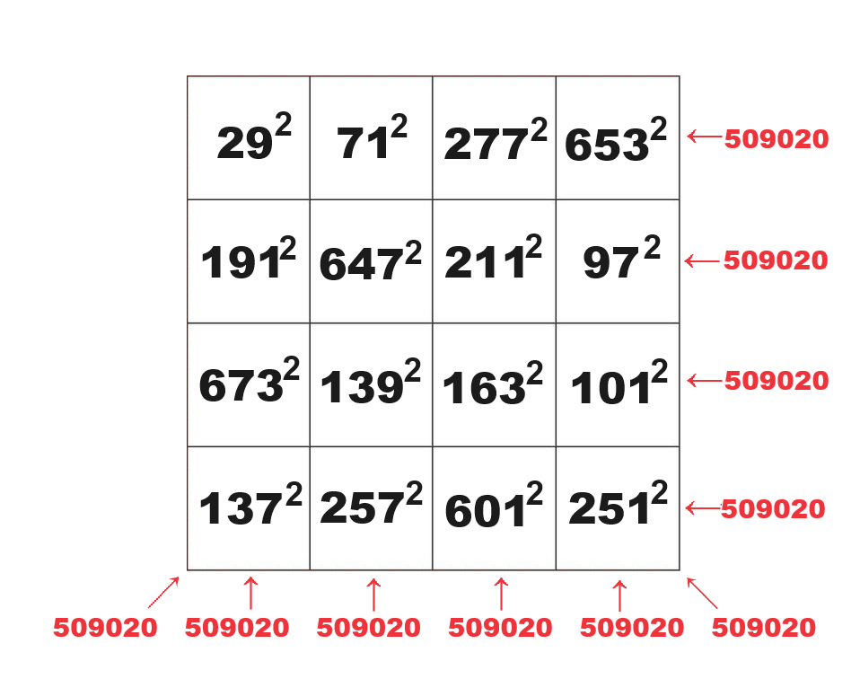 素数の平方数から成る4x4平方数魔法陣A(16個)をLの小さい順に並べ替えて、A*を表示すると、以下のようになる。