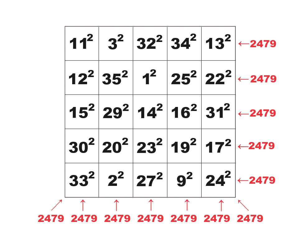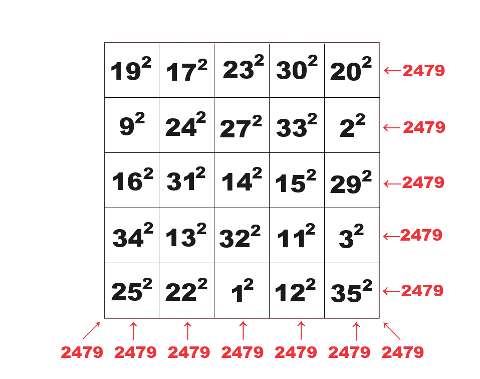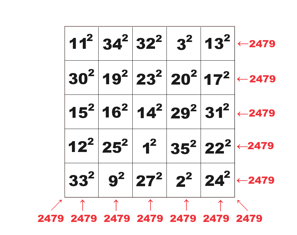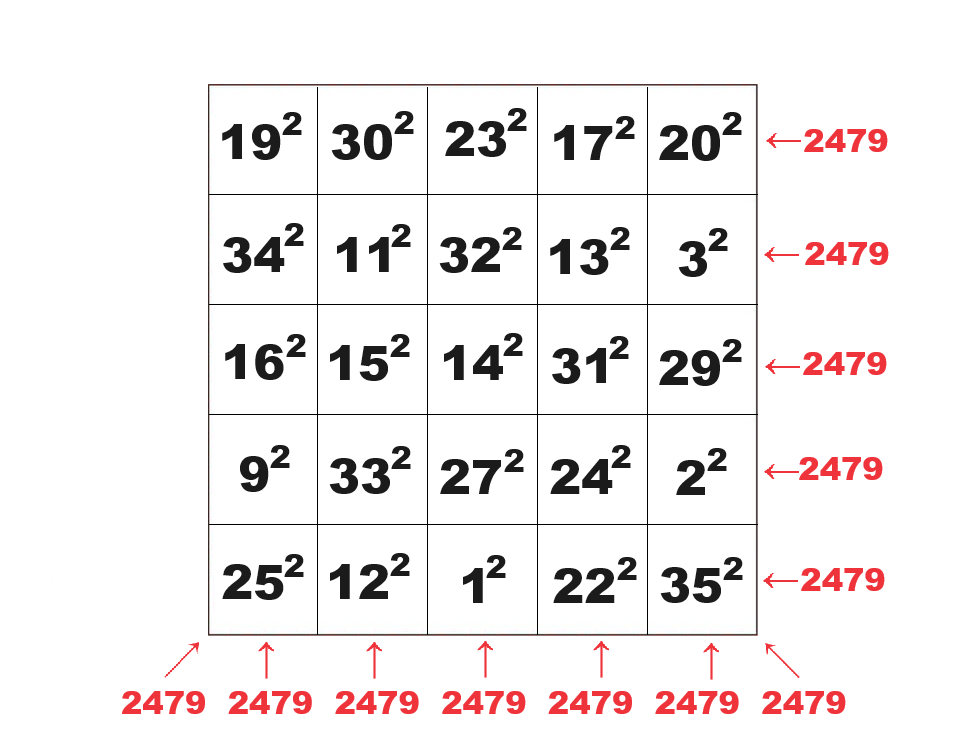 5x5平方数魔法陣で、Lが2番目に小さいのは、L=2479(L4=2283)のもの(4個)で、以下のようになる。
