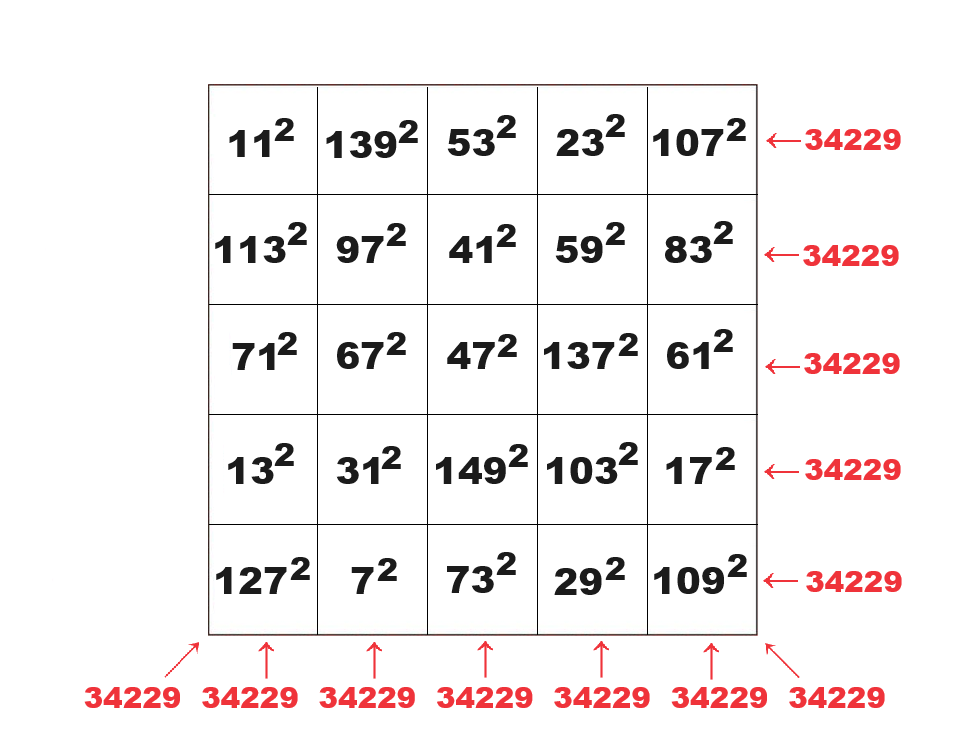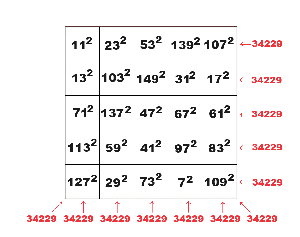 素数の平方数から成る5x5平方数魔法陣で、Lが最も小さいのは、L=34229(L4=32020)のもの(2個)で、以下のようになる。