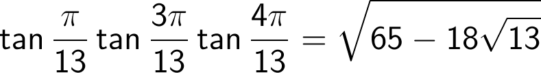 tan(π/13)tan(2π/13)tan(3π/13)tan(4π/13)tan(5π/13)tan(6π/13) = sqrt(65+18*sqrt(13))*sqrt(65-18*sqrt(13)) = sqrt(652-182・13) = sqrt(13)