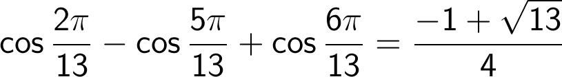 cos(2π/13)-cos(5π/13)+cos(6π/13)を求めよ。
